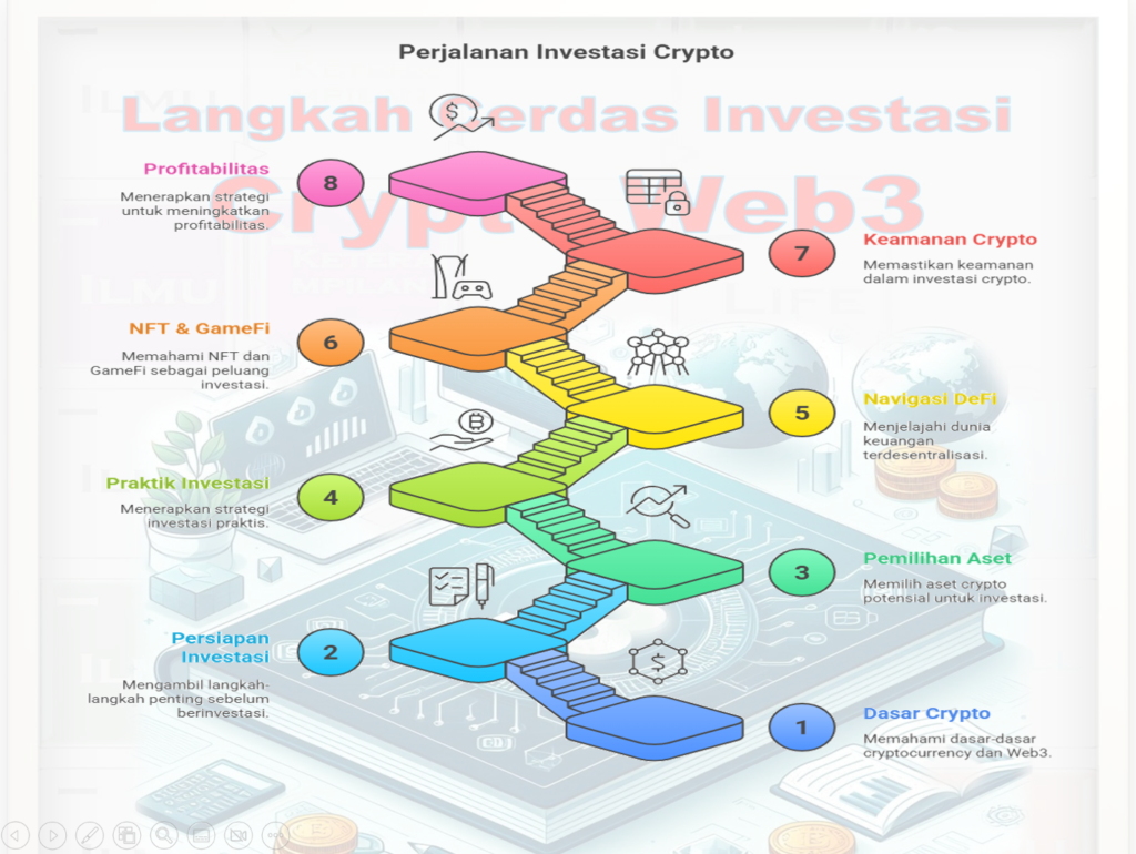 Ebook Langkah Cerdas Investasi Crypto Web3 — panduan praktis, step-by-step dari nol sampai mahir. Didesain agar pembaca IKHLAS dan pemula bisa langsung praktek: dari memahami konsep dasar, membuka wallet, keamanan kunci privat, hingga strategi trading/investasi dan praktik DeFi/Web3 yang aman dan beretika.